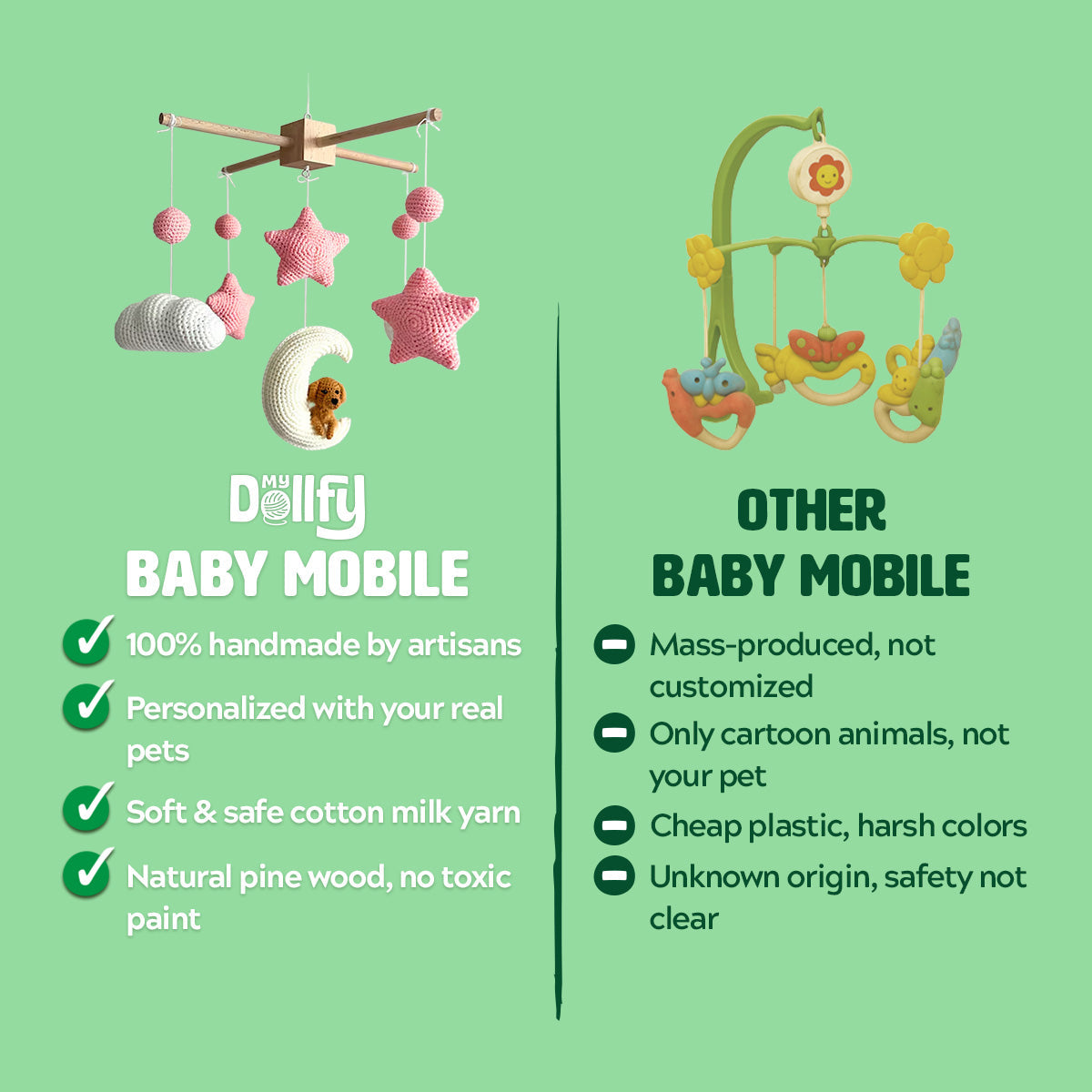 Introducing My Dollfy's Custom Crochet Pet Nursery Mobile! This delightful mobile features personalized crochet pets made from your photos, creating a unique and heartwarming addition to your baby's nursery. Each pet is meticulously handcrafted with love and care, ensuring a soft and safe decoration for your little one. Capture the essence of your beloved pets and provide a soothing and visually stimulating experience for your baby with this one-of-a-kind crochet mobile. Order now to bring a touch of personalized charm to your nursery!